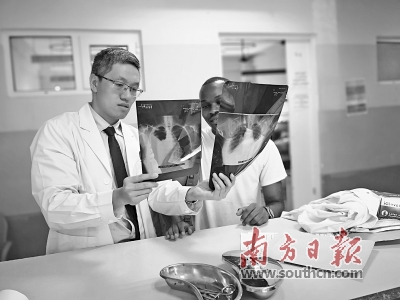 中國(guó)(廣東)第九批援加納醫(yī)療隊(duì)隊(duì)員在指導(dǎo)當(dāng)?shù)蒯t(yī)生閱片。受訪(fǎng)者供圖