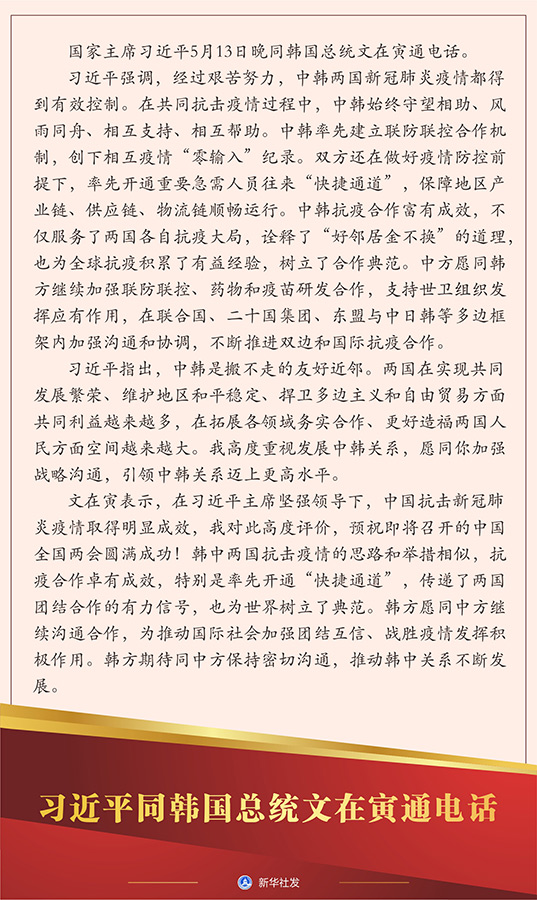 新華社北京5月13日電 國(guó)家主席習(xí)近平5月13日晚同韓國(guó)總統(tǒng)文在寅通電話(huà)。