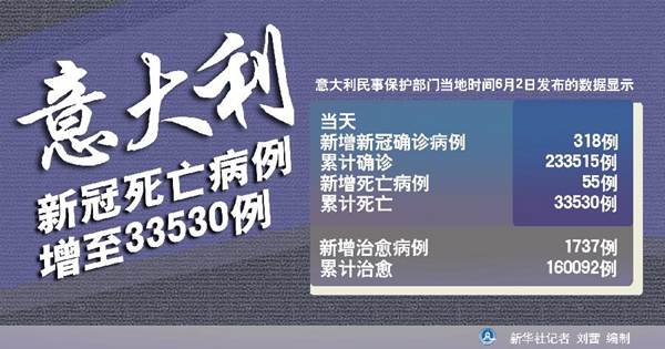 新華社羅馬6月2日電(記者陳占杰)意大利民事保護部門2日發布的數據顯示,該國當天新增新冠確診病例318例,累計確診233515例;新增死亡病例55例,累計死亡33530例。