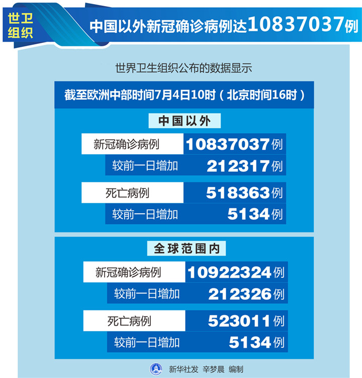 新華社日內瓦7月4日電(記者劉曲)世界衛生組織4日公布的最新數據顯示,中國以外新冠確診病例達到10837037例。