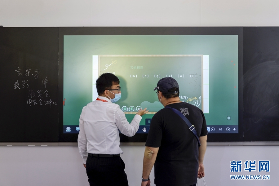 9月5日,一名男子在服貿(mào)會(huì)5G通信服務(wù)專題展區(qū)了解一款智慧黑板。此產(chǎn)品可實(shí)現(xiàn)普通黑板書寫、電子白板交互、數(shù)字資源調(diào)用、多媒體課件演示、音頻錄制、遠(yuǎn)程交互及直播等功能。 新華社記者 李木子 攝