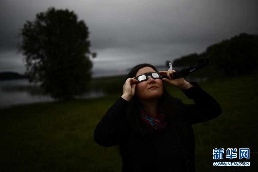 12月14日,一名女子在智利南部河大區的潘吉普伊觀賞日全食。新華社發