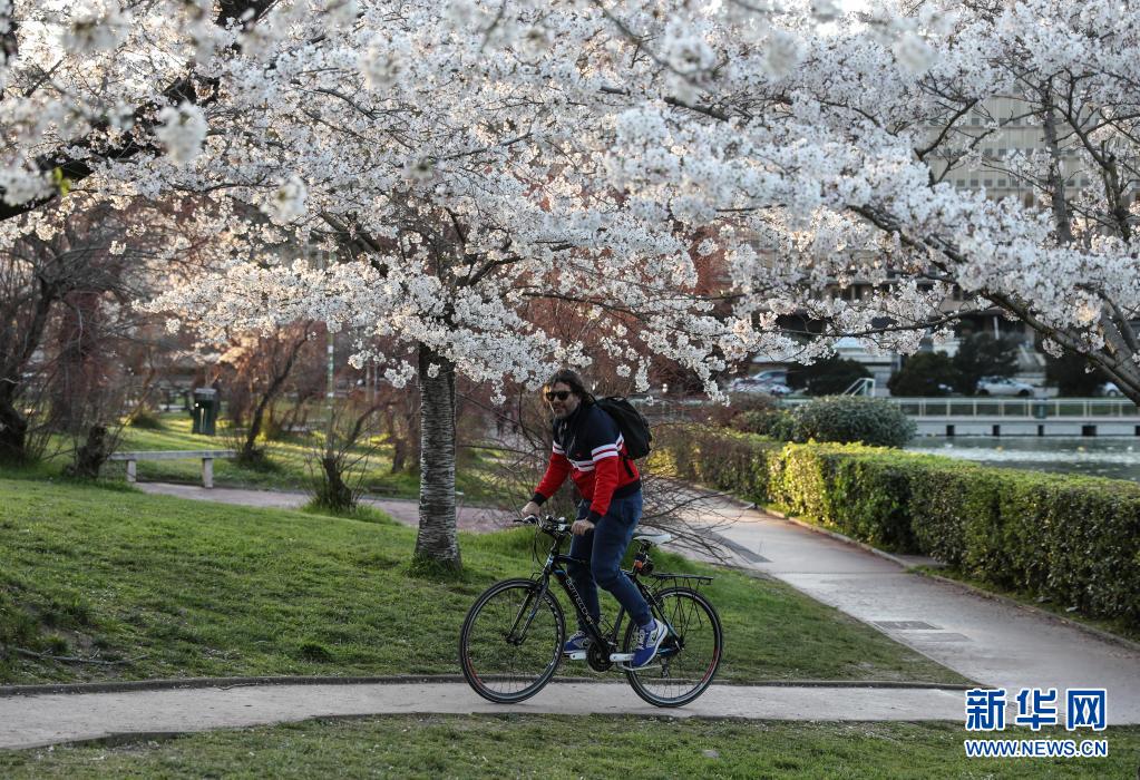 3月24日,市民騎車從意大利首都羅馬盛開的櫻花樹下經過。新華社記者 程婷婷 攝