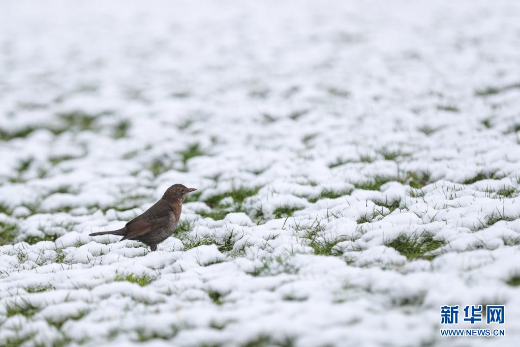 4月7日,一只鳥在比利時布魯塞爾五十周年紀念公園積雪的草地上覓食。