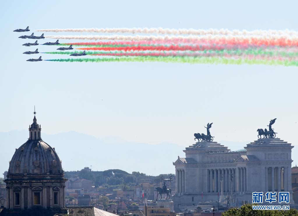 4月25日,意大利“三色箭”飛行表演隊(duì)在羅馬舉行的紀(jì)念儀式上噴出代表意大利國(guó)旗顏色的紅白綠三色煙霧。