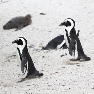4月25日,一群非洲企鵝在南非西蒙鎮企鵝灘上行走。