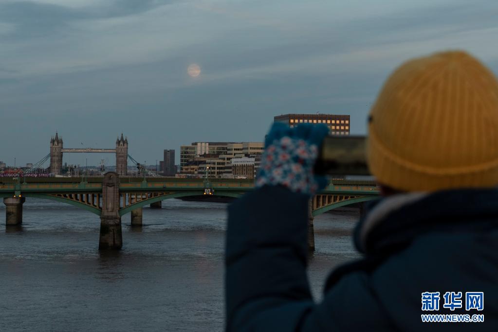 4月26日,一名女子在英國(guó)倫敦拍攝塔橋上空的“超級(jí)月亮”。