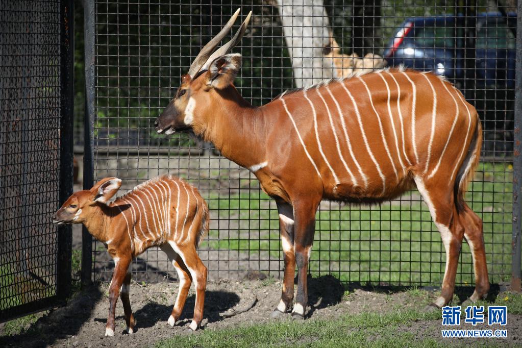 5月10日,兩周大的幼年山地紫羚與母親一起在波蘭首都華沙的華沙動物園的籠舍中散步。
